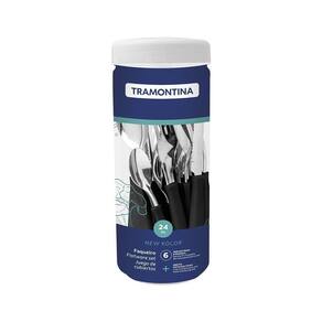 Jogo de Talheres 24 Peças Tramontina New Kolor 23198093 Preto - Características Gerais do Produto: Material: Aço Inox e Polipropileno Linha: New Kolor Pegador / Cabo: Polipropileno Pode ir à Maquina de Lavar Louças: Sim Tratamento do Talher: Facas com tratamento térmico Acompanha o produto: 6 Colheres de Mesa 6 Colheres para Chá 6 Facas para Churrasco 4 6 Garfos de Mesa 1 Pote Plástico : 90 dias junto ao fabricante Marca: Não Informado
