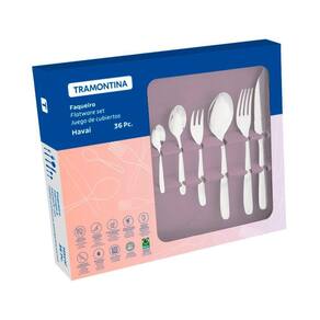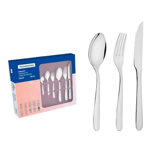 Jogo De Talheres 36 Peças Tramontina Havaí 66905130 Inox Inox 66905130 Especificações Gerais do Produto:Linha: HavaíCor: InoxMaterial: Aço InoxGarantia: 90 dias junto ao fabricanteReferência: 66905130Pegador / Cabo: Aço InoxTratamento do Talher: Facas com tratamento térmicoPode ir à Maquina de Lavar Louças?: Sim O que vem na caixa:6 Colheres de mesa6 Colheres para café6 Colheres para chá6 Facas para churrasco6 Garfos de mesa6 Garfos para torta