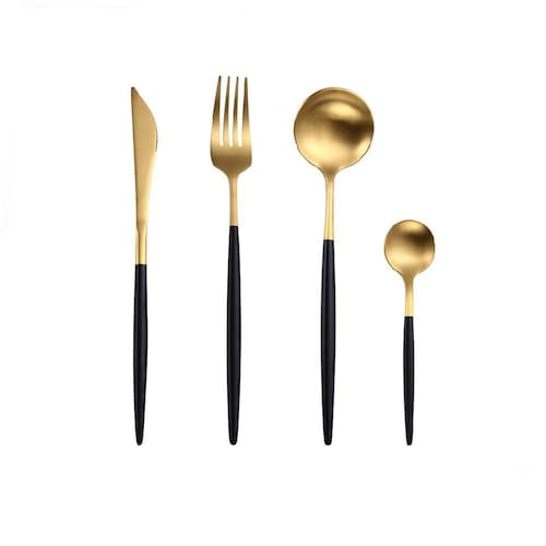 Jogo de Talheres Bicolor Dourado e Preto 16 Peças Jogo de talheres com uma aparência moderna para a sua mesa, apresentam um acabamento com bordas lisas sem manchas ásperas e a coré encantadora. Simples, mas luxuoso o suficiente para tornar suas reuniões elegantes e diferentes.