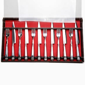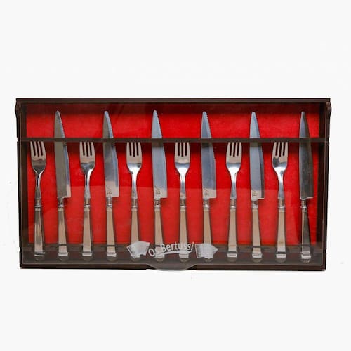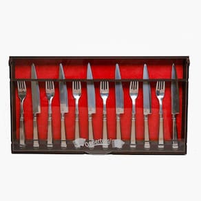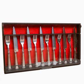 Contém: 6 garfos jumbo e 6 facas jumbo, acompanha estojo feito em madeira.
