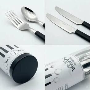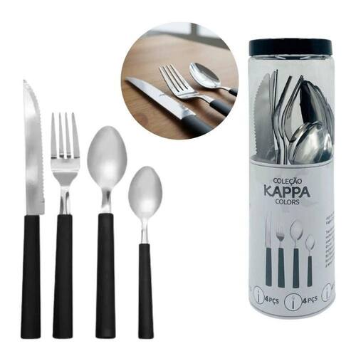 Jogo de Talheres Cabo Preto 16 Peças com 4 Facas 4 Garfos 4 Colheres de Mesa e 4 de Sobremesa em Aço Inox e Cabo