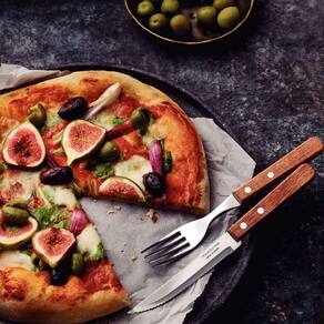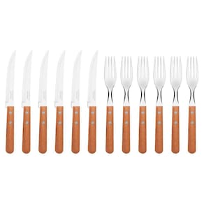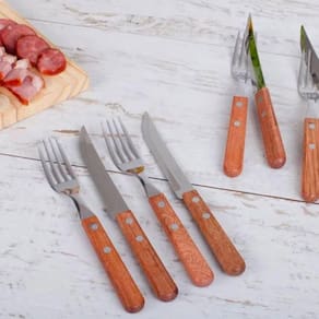 São 48 peças produzidas com cabo de madeira natural e rebites de alumínio, as lâminas das peças são em aço inox e possuem características que as tornam a melhor escolha para servir à mesa.