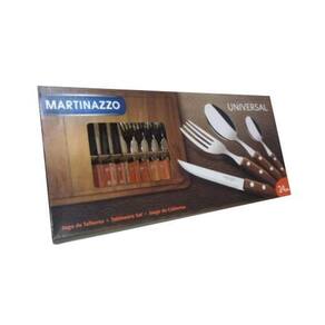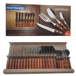 Jogo De Talheres Faqueiro Inox Com Cabo De Madeira 24 Peças Com esse Jogo de talheres Martinazzo você equipa a sua cozinha com produtos de excelente qualidade, alta durabilidade e design estiloso. Sua mesa ficará muito elegante e charmosa. Além disso, todos os componentes do conjunto são feitos em material resistente, perfeitos para sua cozinha e sua mesa. O Faqueiro inox 24 peça Universal é prático e de fácil manuseio, conferindo resistência e facilitando na sua limpeza. O corte é garantido pelo tratamento térmico aplicado às lâminas, que garante durabilidade no fio de corte e maior resistência à corrosão. Sua espessura mesmo com uso intenso se mantém inalterada, tendo alta resistência e durabilidade. Seu charme é dado pelo seu cabo rústico de madeira, finalizado com rebites de alumínio. Informações Gerais: Material em aço inox e Cabo de Madeira. Dimensão Aproximada: Garfo: 19x2,5x2,1 Espessura: 1mm Faca: 21x2x1 Espessura: 1,2mm Colher: 19x4x2,5 Espessura: 1,2mm Colherinha: 15x2,8x1,5 Espessura: 1,2mm Recomendações de Uso: Use apenas água, sabão ou detergente e uma esponja macia. Produtos como palha de aço não são recomendados, pois poderão riscar ou prejudicar o brilho dos talheres. Após a Lavagem enxágue bem cada peça e as sequem bem. COMPOSIÇÃO 06 Colheres de Mesa 06 Garfos de Mesa 06 Facas de Messa 06 Colher Sobremesa Ean: 7896479932248
