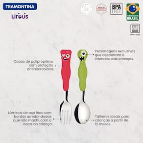 Com o jogo de talheres infantil Tramontina Lirous colorido 02 peças você irá proporcionar uma refeição muito mais agradável e cheia de diversão para os pequenos. Os talheres são produzidos com lâminas em aço inox e cabos de polipropileno, o que lhes proporciona alta resistência e durabilidade. Eles ainda são coloridos e vão estimular ainda mais os sentidos das crianças! Orientações Lâminas de aço inox com bordas arredondadas que não machucam a boca da criança.Cabos de polipropileno que possuem maior resistência e durabilidade. Talheres com proteção antimicrobiana incorporada no processo de injeção que dura por toda vida útil do produto, inibindo o crescimento de bactérias e fungos. Podem ir a máquina de lavar louças, facitando a limpeza. Produtos Livre de BPA: O Bisfenol-A é um componente químico usado na produção de alguns plásticos como o Policarbonato. Este componente pode ser prejudicial à saúde e por isso a Tramontina não o utiliza em seus produtos. Características Gerais EAN13 7891112302204 DUN14 17891112302201 NCM 8215.20.00 Peso Líquido 0,0600 kg. Peso Bruto 0,0800 kg. Metragem 0,000578 m³. Dimensões Embalagem (Compr. X Larg. X Alt.) 105x 20x 275 mm. Observações Recomenda-se o uso destes produtos para crianças com 12 meses ou mais. Tenha cuidado ao manusear o garfo por ser produto perfurante. Antes da primeira utilização, lave bem as peças e seque-as. Estes produtos podem ir à máquina de lavar, porém não recomendamos usar produtos abrasivos como saponáceos, esponjas rígidas ou palhas de aço. Seque-os bem antes de guardar. Para descarte dos produtos e embalagem siga as orientações de reciclagem vigentes.Atenção: Por razões de segurança e saúde do seu filho, utilizar sempre os produtos com supervisão de um adulto. Não utilize os produtos caso apresentarem dano ou defeito. Verifique sempre a temperatura do alimento antes da alimentação.