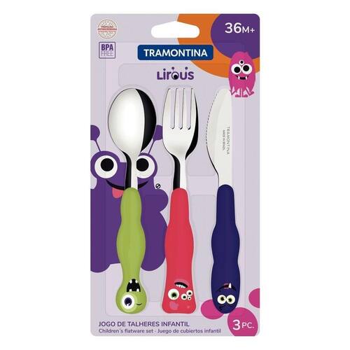 Jogo de Talheres Infantil Lirous com Lâminas em Aço Inox e Proteção Antimicrobiana Colorido Tramontina