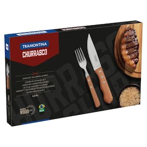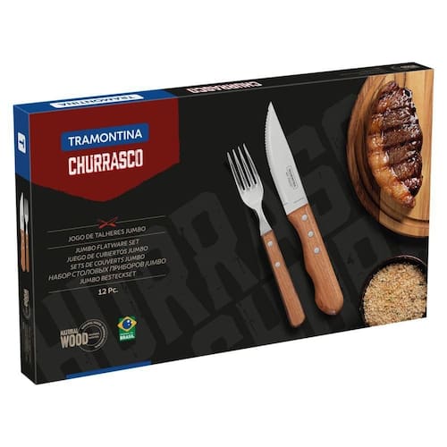 Jogo De Talheres Jumbo Para Churrasco Tramontina Com Laminas Em Aço Inox E Cabos Em Madeira Natural 12 Peças Jogo para Churrasco Tramontina Dynamic com Lâminas em Aço Inox e Cabos de Madeira Natural 12 Peças Para saborear aquele churrasco especial com a família e os amigos, conte com o jogo para churrasco Tramontina Dynamic com lâminas em aço inox e cabos de madeira natural 12 peças. Desenvolvido para lhe proporcionar praticidade e beleza à sua mesa, ele tem peças produzidas com lâminas em aço inox, onde as facas tem maior durabilidade em seu fio de corte devido ao tratamento térmico e os garfos contam com maior resistência devido a estampagem. Seus cabos são em madeira natural e contam com rebites de alumínio que os deixam com um belíssimo design. Escolha seu corte de carne preferido e compartilhe sua mesa com a Tramontina!