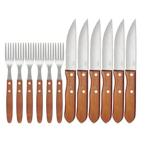 Composto por seis facas e seis garfos, o Conjunto para Churrasco Garfo e Faca 12 Peças Mor é excelente para fazer parte do seu almoço de domingo reunindo a família e os amigos. Unindo estilo e design, são produzidos em aço inox com cabo em madeira. Extremamente duráveis, podem ir à lava-louças e permanecem bonitos por muito mais tempo. Diferenciada, a faca de serra possui lâmina mais larga e cabo mais robusto que as facas de modelo tradicional, garantindo o manuseio firme e corte preciso até mesmo nos maiores pedaços de carne.