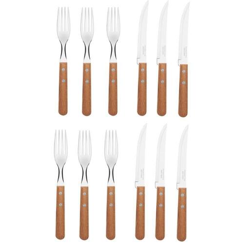 Características: - Lâminas de aço inox. - As lâminas das facas têm maior durabilidade do fio devido ao tratamento térmico. - As lâminas dos garfos conta com maior espessura e uma estampagem do aço que garante maior resistência, evitando deformações. - Os cabos são de madeira natural. - Rebites de alumínio.