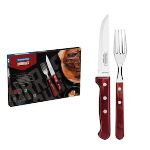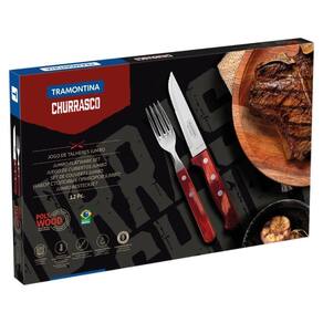 O churrasco na sua casa vai atingir um nível superior com o jogo de talheres jumbo Tramontina Churrasco com lâminas em aço inox e cabos de madeira tratada polywood vermelho 12 Peças. São 12 peças perfeitas para serem usadas para servir as melhores carnes aos seus convidados. Os cabos de madeira tratada Polywood garantem mais resistência a impactos e a altas temperaturas. Além disso, levam mais beleza à mesa, devido a sua cor vibrante. Produzidas com lâmina em aço inox, as facas possuem maior durabilidade do fio, pois recebem tratamento térmico. Os garfos contam com lâminas de maior espessura e uma estampagem do aço que garante maior resistência, evitando deformações. São fáceis de limpar, podendo ir à máquina de lavar louças.
