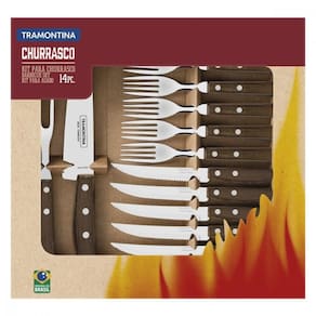 Jogo De Talheres Para Churrasco Tramontina Em Aço Inox Com Cabo De Madeira Natural 14 Peças Kit para Churrasco Tramontina em Aço Inox com Cabo de Madeira Natural 14 Peças Surpreenda os seus convidados com um belo churrasco e toda a praticidade do Kit para Churrasco Tramontina em Aço Inox com Cabo de Madeira Natural 14 Peças da linha Churrasco. Desenvolvido especialmente para honrar esse momento, o jogo é produzido com lâminas em aço inox. Acompanha facas e garfos com cabos produzidos em madeira natural, permitindo que você possa aproveitar muitos momentos com toda a qualidade que só a Tramontina oferece.
