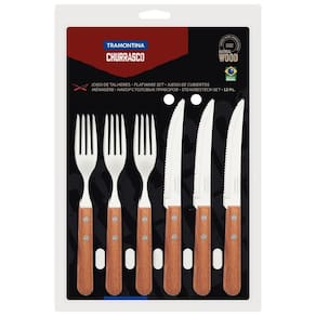 O jogo de talheres Tramontina churrasco com lâminas em aço inox e cabos de madeira natural 12 peças é a escolha perfeita para garantir durabilidade e conforto para os encontros. São 12 peças produzidas com cabo de madeira natural e rebites de alumínio, as lâminas das peças são em aço inox e possuem características que as tornam a melhor escolha para servir à mesa. As facas têm maior durabilidade do fio devido ao tratamento térmico e os garfos contam com lâminas com maior espessura e uma estampagem do aço que garante maior resistência. São itens que garantem bom gosto e sofisticação para servir os amigos.