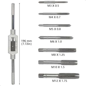 Inclui: M3 x 0,5 mm / 3 mm de diâmetro M4 x 0,7 mm / 4 mm de diâmetro M5 x 0,8 mm / 5 mm de diâmetro M6 x 1,0 mm / 6 mm de diâmetro M8 x 1,25 mm / 8 mm de diâmetro M10 x 1,50 mm / 10 mm de diâmetro M12 x 1,75 mm / 12 mm de diâmetro 1 Chave de encaixe para macho (vira macho T)