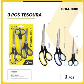 Produto: Jogo de tesouras 5.1/2" a 8.1/2" com 3 peças - BOM-3301 Marca: Bomvink Descrição: O Jogo de tesouras 5 1/2" a 8 1/2" com 3 peças - BOM-3301 da Bomvink é uma escolha essencial para quem busca qualidade e precisão no corte para diferentes necessidades. Desenvolvidas em aço inoxidável resistente, cada tesoura deste conjunto foi criada para oferecer o máximo em durabilidade e eficiência.