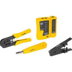 Conjunto para teste, crimpagem e inserção de cabos de rede. Testa a correspondência de cabos par trançado, podendo detectar também conexões erradas, curtos-circuitos e circuitos abertos. Possui duas velocidades de leitura. Testador de cabos de rede indicado para testar continuidade/sequência de cabos montados com RJ11, RJ12 e RJ45. Alicate desencapador de fios e cabos de rede indicado para desencapar e cortar cabos de par trançado UTP e STP. Alicate crimpador ideal para desencapar, cortar e crimpar fios de rede lógica e rede de telefonia. Utilizar em terminais RJ45 8 pinos e RJ11/12 4 pinos e 6 pinos . Alicate de inserção punch down utilizado para conectar e cortar os fios nos módulos RJ11 e RJ45, compatível com bloco do tipo M10. Material: Plástico e metal Tipos de plugues compatíveis: RJ11, RJ12 e RJ45 Tipos de cabos compatíveis: Cabo par trançado