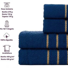 Jogo De Toalha 2 Banho + 2 Rosto Montreal 100% Algodão Alta Absorção - Azul Marinho Jogo de Toalha 2 Banho 2 Rosto - 4 Peças da Coleção Montreal 100% Algodão Alta Absorção Sobre as Toalhas: Composição - 2 Toalhas de Banho + 2 Toalhas de RostoGramatura - 330 G/mPeso Toalha de Banho - 290 a 300 GramasPeso Toalha de Rosto - 110 a 120 GramasTamanho Toalha de Banho - 70x130 cmTamanho Toalha de Rosto - 45x70 cmFio - 16/1 QUALIDADE MONTREAL As Toalhas Montreal são confeccionadas com 100% algodão, tendo alta absorção de água desde a primeira vez de uso. São indicadas para uso no Dia a Dia, Pousada, Estética, Praia, Spas, Hoteis e Moteis. Feito com fio 16/1 singelo um dos melhores fios para produção de toalhas tornando-as mais macias e com alta durabilidade nas lavagens industriais.O tingimento é reativo deixando a Toalha Montreal com cores modernas e vivas, por ser reativo não tem o risco de soltar tinta. Essa toalha contém a barra decorada em dourado para dar um toque de modernidade e luxo ao seu Ambiente.A Toalha Montreal é desenvolvida com os melhores fios para dar macies a seu corpo, tingidas em cores fortes e alegres para deixar seu ambiente mais aconchegante e agradável. Pode comprar a sua toalha tranquilamente, temos a certeza que você vai gostar, será um grande prazer lhe atender!Ideal para pessoas que buscam qualidade e resistência, com toalha macia e com ótima absorção. Compre este Kit Montreal de presente e surpreenda quem você ama!