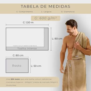 O fio da toalha Intense é produzido com algodão indiano selecionado, e passa pelo processo de penteadeira (o famoso fio penteado) removendo resíduos que podem estar no algodão e garantindo fibras longas, macias e mais resistentes. A toalha Intense é o casamento perfeito para entregar o melhor na hora de se secar. Sua gramatura é de 600 gramas por metro quadrado. Cada toalha de banho pesa aproximadamente 720 gramas e cada toalha de rosto pesa 240 gramas. O tamanho da toalha de banho é de 80cm de largura por 1,50m de comprimento. Esta toalha é classificada como banhão e é uma das maiores do mercado. Cada toalha de rosto mede 50cm de largura por 80cm de comprimento. Este jogo de toalhas de banho é composto por 4 peças, sendo: 2 toalhas banhão e 2 toalhas de rosto. A toalha Intense possui o corpo inteiro fabricado 100% em algodão, dando maior poder de absorção e maciez.