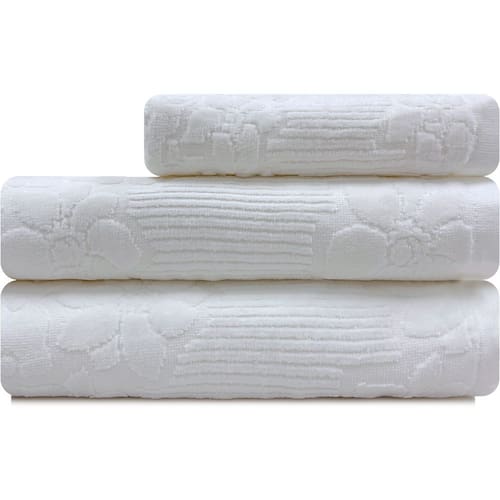 De um lado, apresentam textura atoalhada; do outro, acabamento aveludado com toque sedoso — ambos com super absorção. O design moderno combina acabamento em jacquard com estampas em relevo por toda a peça e barrado com detalhes florais.