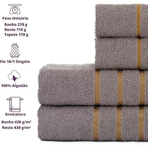 Composição - 2 Toalhas de Banho + 2 Toalhas de RostoGramatura - 330 G/m Peso Toalha de Banho - 290 a 300 Gramas Peso Toalha de Rosto - 110 a 120 GramassTamanho Toalha de Banho - 70x130 cm Tamanho Toalha de Rosto - 45x70 cm Fio - 16/1