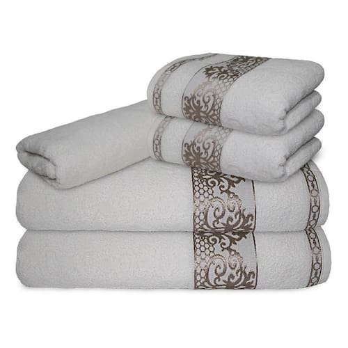 Desfrute de momentos de puro conforto e sofisticação após o banho com nosso Jogo de toalhas de 100% algodão. Elas são perfeitas para envolver você em suavidade e aconchego, além de adicionar um toque de elegância ao seu banheiro com suas barras lindamente decoradas.
