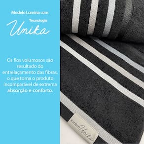 Essa toalha clássica, a queridinha do Brasil, destaca-se por seu design moderno, com listras formando um contraste muito elegante na barra decorativa que resulta em um toque sofisticado. Além da beleza, a Toalha Lumina incorpora tecnologia de ponta.