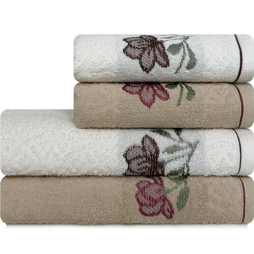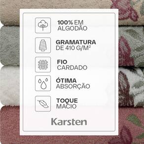 A BF Casa traz com exclusividade a Karsten Encanto, um relançamento da toalha floral campeã de vendas da Karsten. Hoje, você só encontra aqui! - 2 Toalhas de Banho – 70cm x 135cm - 2 Toalhas de Rosto – 48cm x 80cm Especificações: - 100% Algodão - Gramatura: 410g/m² - Tipo de fio: Cardado - Modelo: Encanto - Marca: Instruções de lavagem: Lavar à temperatura máxima de 60°C; Não alvejar; Secar à sombra; Passar a ferro com temperatura máxima de 150°C; Não lavar a seco.