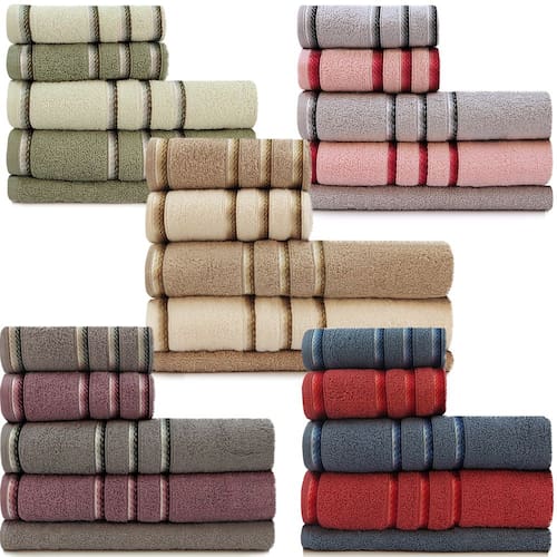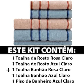 Este jogo contém 5 peças: - 02 Toalhas Rosto (45cm x 68cm) - 02 Toalhas Banhão (78cm x 1,50m) - 01 Piso de Banheiro (45cm x 68cm)