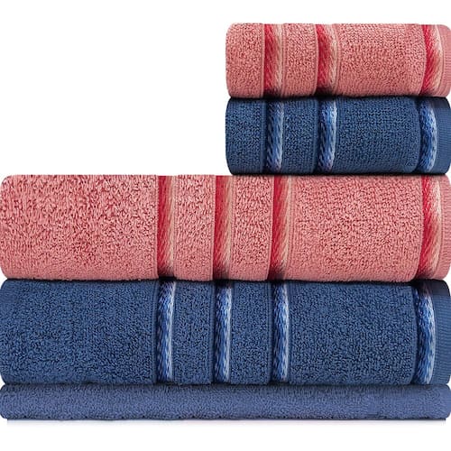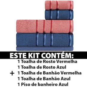 Este jogo contém 5 peças: - 02 Toalhas Rosto (45cm x 68cm) - 02 Toalhas Banhão (78cm x 1,50m) - 01 Piso de Banheiro (45cm x 68cm)