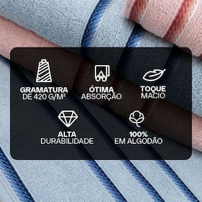 O toque de bom gosto da Appel trabalhado na linha de tolhas Classic, combina a textura clássica extra macia e os traços limpos e contemporâneos. Deixe Seu Banheiro Mais Charmoso. Um jogo de toalhas com excelente absorção e design especial. Com uma paleta de cores diferenciada ele vai deixar seu ambiente muito mais elegante e sofisticado. Mais conforto e qualidade para o seu dia!