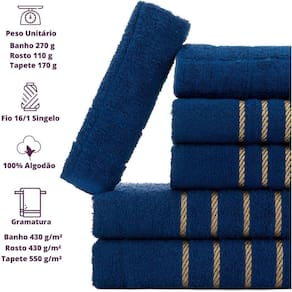 Jogo De Toalhas 6 Pçs - 2 Banho 2 Rosto 2 Piso Montreal 100% Algodão Azul Marinho Jogo de Toalhas 2 Banho 2 Rosto 2 Piso - 6 pçs Montreal 100% Algodão Qualidade das Toalhas Montreal: As Toalhas Montreal são confeccionadas com 100% algodão, tendo alta absorção de água desde a primeira vez de uso. São indicadas para uso no Dia a Dia, Pousada, Estética, Praia, Spas, Hoteis e Moteis. Feito com fio 16/1 singelo um dos melhores fios para produção de toalhas tornando-as mais macias e com alta durabilidade nas lavagens industriais.O tingimento é reativo deixando a Toalha Montreal com cores modernas e vivas, por ser reativo não tem o risco de soltar tinta. Essa toalha contém a barra decorada em dourado para dar um toque de modernidade e luxo ao seu Ambiente.A Toalha Montreal é desenvolvida com os melhores fios para dar maciez a seu corpo, tingidas em cores fortes e alegres para deixar seu ambiente mais aconchegante e agradável. Pode comprar a sua toalha tranquilamente, temos a certeza que você vai gostar, será um grande prazer lhe atender!Ideal para pessoas que buscam qualidade e resistência, com toalha macia e com ótima absorção. Compre este Kit Montreal de presente e surpreenda quem você ama! Resumo Técnico do Kit Montreal 6 Peças: Composição - 2 Toalhas de Banho + 2 Toalhas de Rosto + 2 Tapete PisoGramatura - 330 G/mPeso Toalha de Banho - 290 a 300 GramasPeso Toalha de Rosto - 110 a 120 GramasTamanho Toalha de Banho - 70x130 cmTamanho Toalha de Rosto - 45x70 cmFio - 16/1Marca: Toalhas Beka Garanta já o seu Jogo de Toalhas 2 Banho 2 Rosto 2 Piso - 6 pçs Montreal 100% Algodão e tenha a melhor experiência de conforto e qualidade em seu banheiro! Marca: Toalhas Beka