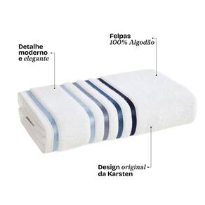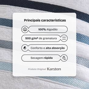 100% Algodao Gramatura 500g/m2 Tecnologias Unika e SoftMax, da Karsten: excelente absorcao, volume extra e maciez incrivel gracas as fibras aeradas Alta absorcao: seca com eficiencia e proporciona conforto imediato desde o primeiro uso Fio penteado: mais suavidade e resistencia para o uso diario Design elegante: barras em degrade de listras brilhantes que valorizam a decoracao do banheiro Durabilidade: alem do tratamento antipilling nao forma bolinhas e tambem e pre-lavada e pre-encolhida Produto original Karsten: industria com mais de 140 anos no Brasil Ficha tecnica do jogo de toalhas Lumina: Composicao: 98% Algodao 2% Poliester apenas no bordado do barrado Gramatura: 500g/m2 Marca: Karsten Modelo: Lumina Quantidade de pecas: 5 itens Conteudo e dimensoes: 02 Toalhas Banhao 86cm x 150cm 02 Toalhas de Rosto 48cm x 80cm 01 Toalha de Piso 45cm x 65cm Cuidados para garantir a durabilidade das toalhas: Lavar tipos de tecidos distintos separadamente Nao lavar cores claras e escuras no mesmo ciclo Lavar no ciclo leve, suave ou delicado Enxaguar com bastante agua Utilizar quantidade minima de amaciante e sabao Sacudir bem as pecas antes de pendurar Ler atentamente as instrucoes na etiqueta
