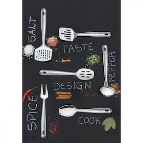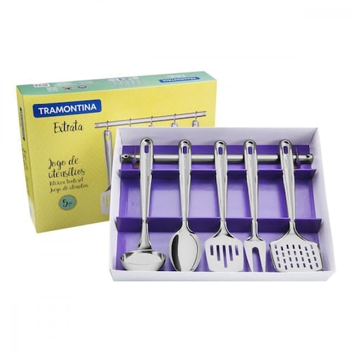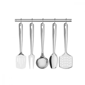 Totalmente feitos de aço inox, por isso não solta nenhum resíduo nos alimentos, mantendo-os saudáveis. Altamente durável, mantém suas características originais, preservando a beleza, a higiene e a durabilidade do material. Possuem furo no cabo, o que permite incluí-la na decoração da cozinha. Podem ser lavados diariamente na máquina de lavar louças.Medidas do suporte de parede:Comprimento = 42 cmLargura = 2,2 cmAltura= 1,6 cm