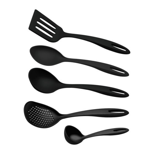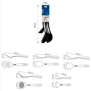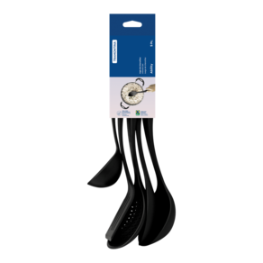 Utensílios de nylon resistentes até uma temperatura de 180 °C. Cabos com furo passante possibilitando que sejam pendurados na sua cozinha. Utensílios ideais para uso em panelas com revestimentos antiaderentes e cerâmicos, pois não danifica o produto. Podem ir à máquina de lavar louças facilitando seu dia a dia.