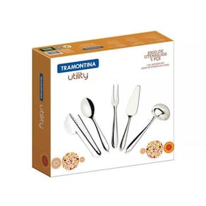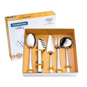 Jogo De Utensílios Tramontina Utility Em Aço Inox 5 Peças Uma mesa bem-posta é uma presente que todo mundo pode se dar todos os dias. Talheres e acessórios brilhantes, uma toalha bonita e pequenos toques de decoração tornam qualquer momento mais especial. Afinal, uma boa refeição deve ser saboreada também com os olhos. Recomendações de Uso: - Antes de utilizar o , remova as eventuais etiquetas e lave-o com água quente e detergente.- Durante a lavagem use somente esponja macia, outros tipos de produtos, como palha de aço, poderão riscar ou prejudicar o brilho dos talheres.- Enxágue bem cada peça a fim de remover totalmente os resíduos dos produtos de limpeza, que por serem abrasivos, podem danificar o inox.- Após a lavagem enxugue os talheres, pois as substâncias químicas contidas na água poderão causar manchas.- Sempre que possível use água quente, pois renova o brilho dos talheres.- Evite o das peças com superfícies quentes, pois podem provocar a descoloração do produto.- Quando usar a máquina de lavar louça, recomendamos retirar os talheres logo que tenha terminado o ciclo enxaguar, a fim de que os mesmos sejam secados manualmente.- Foto meramente ilustrativa. Informações Adicionais:
