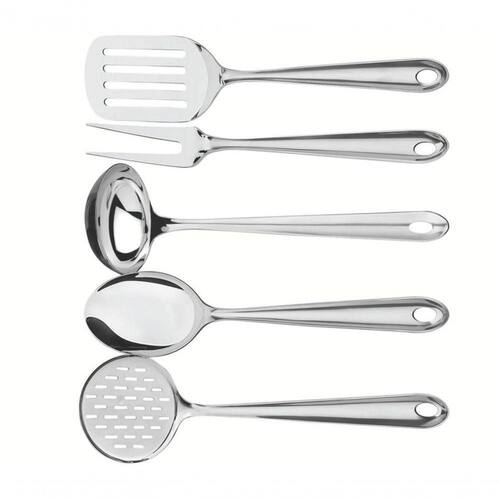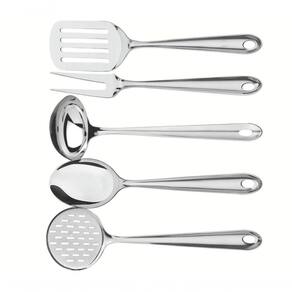 Jogo De Utensílios Tramontina Utility Em Inox Com Suporte 5 Peças Descobrir novas receitas, preparar os alimento da melhor forma e com os melhores instrumentos é parte da inspiração dos artistas. E, para tornar esta realidade uma arte, a Tramontina desenvolve seus utensílios com o que há de mais moderno, levando qualidade e beleza à sua cozinha. Recomendações de Uso: Antes do uso: Antes de utilizar o , remova as eventuais etiquetas e lave-o com água quente e de uso: Durante a lavagem use somente esponja macia, outros tipos de produtos, como palha de aço, poderão riscar ou prejudicar o brilho dos talheres. Enxágue bem cada peça a fim de remover totalmente os resíduos dos produtos de limpeza, que por serem abrasivos, podem danificar o inox. Após a lavagem enxugue os talheres, pois as substâncias químicas contidas na água poderão causar manchas. Sempre que possível use água quente, pois renova o brilho dos talheres. Evite o das peças com superfícies quentes, pois podem provocar a descoloração do produto. Quando usar a máquina de lavar louça, recomendamos retirar os talheres logo que tenha terminado o ciclo enxaguar, a fim de que os mesmos sejam secados manualmente.- Foto meramente ilustrativa.- Embalagem litografada. Informações Adicionais: