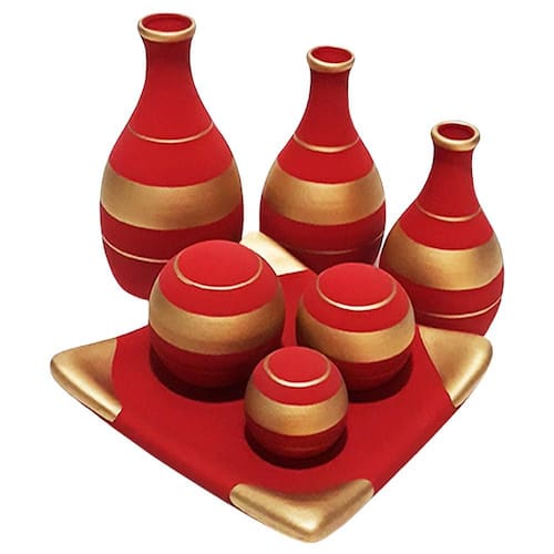 Jogo de vasos trio garrafas e centro de mesa 3 fosca - red golden Jogo de vasos trio garrafas e centro de mesa 3 em cerâmica fosca decor Jogo de vasos trio garrafas e centro de mesa com 3 premium em cerâmica fosca decorativa de alta qualidade e durabilidade com acabamento diferenciado, inspirador e moderno. O produto em cerâmica é uma belíssima peça atemporal, sendo ótimo para entusiastas e profissionais da decoração, pois garante charme, elegância, modernidade e sofisticação. Repagine e decore a sua casa, cozinha, sala de jantar, sala de estar, aparadores e mesas em gerais, deixando-as com um clima agradável, alegre e descontraído, sendo também uma ótima opção de presente. Dimensões: - centro de mesa 3 : altura: 12 cm x largura: 20 cm x comprimento: 20 cm. - vaso grande: altura: 18 cm x largura: 7 cm. - vaso médio: altura: 16 cm x largura: 6 cm. - vaso pequeno: altura: 13,5 cm x largura: 5 cm. Características do produto: - centro de mesa com 3 e trio de garrafas em cerâmica fosca de alta qualidade e durabilidade - pintura artesanal. - produzido por artesões profissionais seguindo um padrão de qualidade que atenda o gosto dos nossos clientes Cuidados: - recomendamos o uso de pano levemente umedecido para sua limpeza. do produto: - o produto é muito bem acomodado dentro da caixa, e super embalado para evitar quebras, ainda assim possuímos um sistema de e troca. Imagens meramente ilustrativas - produto artesanal, podendo variar de cor e/ou tonalidade Marca: Retrofenna Decor