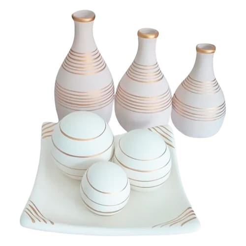 Jogo de vasos trio garrafas e centro de mesa 3 fosca - white gold Jogo de vasos trio garrafas e centro de mesa 3 em cerâmica fosca decor Jogo de vasos trio garrafas e centro de mesa com 3 premium em cerâmica fosca decorativa de alta qualidade e durabilidade com acabamento diferenciado, inspirador e moderno. O produto em cerâmica é uma belíssima peça atemporal, sendo ótimo para entusiastas e profissionais da decoração, pois garante charme, elegância, modernidade e sofisticação. Repagine e decore a sua casa, cozinha, sala de jantar, sala de estar, aparadores e mesas em gerais, deixando-as com um clima agradável, alegre e descontraído, sendo também uma ótima opção de presente. Dimensões: - centro de mesa 3 : altura: 12 cm x largura: 20 cm x comprimento: 20 cm. - vaso grande: altura: 18 cm x largura: 7 cm. - vaso médio: altura: 16 cm x largura: 6 cm. - vaso pequeno: altura: 13,5 cm x largura: 5 cm. Características do produto: - centro de mesa com 3 e trio de garrafas em cerâmica fosca de alta qualidade e durabilidade - pintura artesanal. - produzido por artesões profissionais seguindo um padrão de qualidade que atenda o gosto dos nossos clientes Cuidados: - recomendamos o uso de pano levemente umedecido para sua limpeza. do produto: - o produto é muito bem acomodado dentro da caixa, e super embalado para evitar quebras, ainda assim possuímos um sistema de e troca. Imagens meramente ilustrativas - produto artesanal, podendo variar de cor e/ou tonalidade Marca: Não Informado