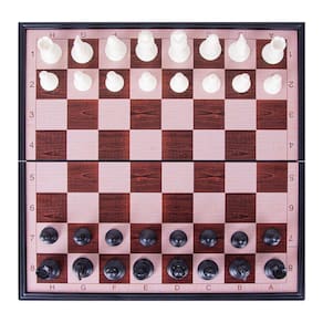 Tabuleiro em plástico 30 x 30 cm, 16 peças claras e 16 escuras de plástico com imã na base. Tabuleiro dobrável com superfície metálica, nas bordas possui marcação numérica na vertical e alfabética na horizontal.