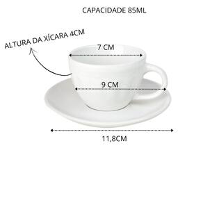 Sirva seu café com charme e elegância com este jogo de xícaras com pires de cerâmica branca, composto por 12 peças (6 xícaras e 6 pires). Cada xícara tem capacidade de 85 ml, ideal para café expresso ou café coado, tornando seus momentos ainda mais especiais.