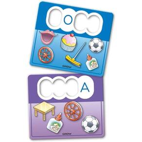 -Ao sobrepor as cartelas que possuem uma mesma figura, seu nome vai sendo revelado e a criança descobre a grafia das palavras.