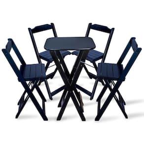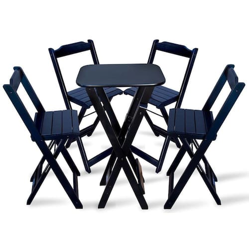 Jogo Dobravel Bistro Com 4 Cadeiras - Pretoé ideal para bares, restaurantes, estabelecimentos, áreas de lazer e tambem para sua casa. Em madeira maciça, tornando-os resistentes e duráveis. Seu design permite que esse conjunto seja encaixado em qualquer ambiente, trazendo um toque a mais para seu estabelecimento. Além de sua durabilidade, o que lhe trará conforto para servir seus clientes. Por ser dobrável torna-se mais fácil guardar, manusear e limpar o produto.Atenção: EVITE USAR PRODUTOS ABRASIVOS E QUÍMICOS PARA LIMPEZA DO PRODUTO, aconselha-se o uso de pano umedecido para melhor conservação mantenha o produto fora de chuva e sol constantes.*imagens meramente ilustrativas*ç Medidas Mesa Bistrô: Tampo 54cm x 45cm Altura 98cmç Dimensões Cadeira Bistrô: Altura da cadeira aberta 95cm Altura da cadeira fechada 105cm Altura até o assento 61cm Largura 41,5cm Largura vão do assento 37,5cm Profundidade 43cm Profundidade do assento 32cmJogo Dobravel Bistro com 4 Cadeiras - Preto