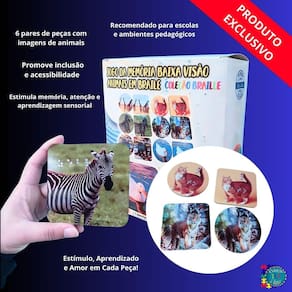 Principais atributos: - 6 pares de peças com imagens de animais e escrita em Braille feita com strass termocolante. - Peças com 9 cm, dois formatos exclusivos para melhor percepção tátil - Promove inclusão e acessibilidade para pessoas com baixa visão - Estimula memória, atenção e aprendizagem sensorial - Material resistente e adequado para uso escolar e doméstico.