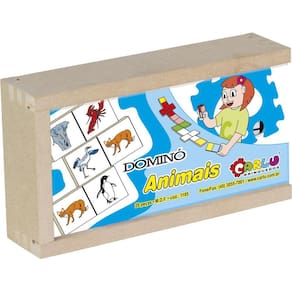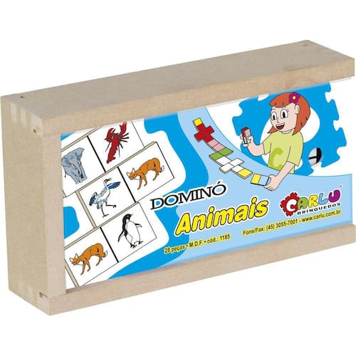 Detalhes :Confeccionado em M.D.F. 28 peças de 7 x 3,5 cm, pintada e serigrafada com tinta ultravioleta atóxica em uma das faces. Embalagem: Caixa de madeira com tampa serigrafada medindo 17 x 9,5 x 4 cm. Lacrada com película de P.V.C. encolhível. Idade: A partir de 3 anos