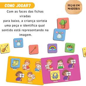 Com esse jogo a criança vai identificar e diferenciar cada um dos 5 sentidos: tato, paladar, olfato, visão e audição. Ela vai sortear uma peca de madeira e entender qual sentido representa quem encontrar primeiro aquela figura em sua cartela, coloca no espaço correspondente ao sentido. Ganha quem completar primeiro os sentidos presentes em sua cartela.