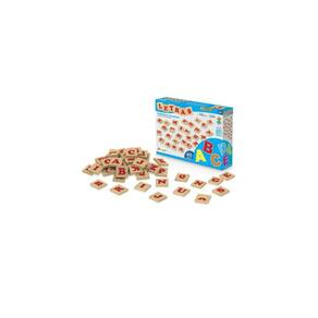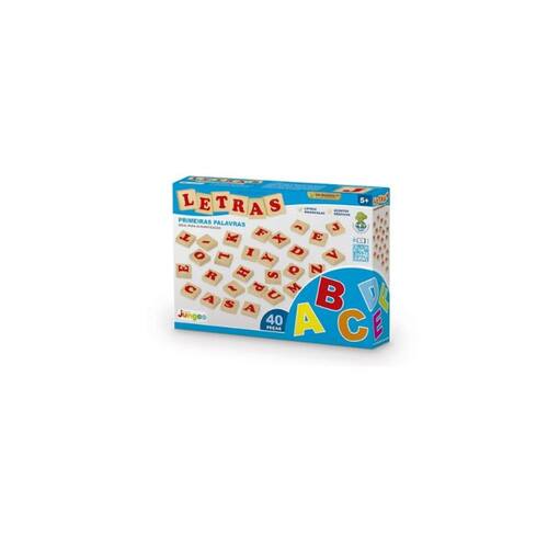 Letras da Junges com 40 peças em madeira de reflorestamento (MDF) 6mm, tamanho de 3x3cm impressas em serigrafia, com letras maiúsculas e acentos gráficos do alfabeto português (completo).