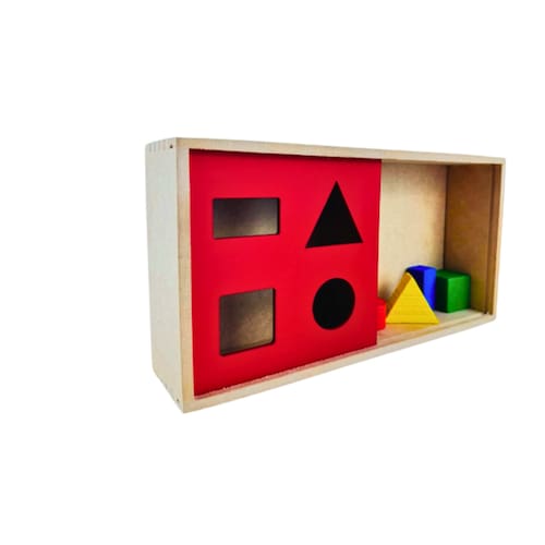 Contém: Caixa de Madeira tamanho 28 x 15 x 6 cm e tampa com 4 formas geométricas (quadrado, retângulo, triângulo e círculo) recortados para encaixe + 4 formas geométricas (quadrado, retângulo, triângulo e círculo) em madeira pintadas com tinta atóxica.
