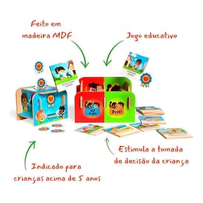 Jogo Educativo Pode ou Não Pode Tomada de Decisão Infantil Desenvolva habilidades essenciais desde cedo com o Jogo Interativo Pode e Não Pode - Brincadeira de Tomada de Decisões, uma ferramenta lúdica e educativa que estimula o raciocínio, a empatia e a compreensão de regras e limites. Ideal para crianças a partir de 5 anos, este jogo promove o aprendizado de forma envolvente, ensinando sobre comportamento seguro, respeito ao próximo e normas sociais de maneira divertida e acessível. Projetado especialmente para pais, educadores e cuidadores que buscam uma maneira interativa de tratar assuntos importantes do dia a dia, o jogo incentiva a criança a refletir, justificar suas escolhas e considerar as consequências de suas decisões. Ao participar das brincadeiras, os pequenos desenvolvem a habilidade de análise crítica e aprendem a lidar com diferentes situações sociais, fortalecendo o senso de responsabilidade e empatia. Composto por uma roleta, plaquinhas de ações e mini medalhas, o jogo proporciona uma experiência dinâmica e participativa. Cada jogada estimula o diálogo e a reflexão, abrindo espaço para conversas enriquecedoras entre adultos e crianças. Seja em ambiente familiar ou educacional, o Jogo Pode e Não Pode é um recurso eficiente para promover momentos de aprendizado e conexão. Além do conteúdo pedagógico de alta qualidade, o jogo se destaca pela sua durabilidade e segurança. Produzido em MDF resistente e com acabamento colorido e atrativo, é um produto certificado pelo INMETRO, oferecendo tranquilidade e confiança para o uso contínuo pelas crianças. Todos os materiais são pensados para garantir a segurança durante o manuseio, respeitando as exigências das normas técnicas de brinquedos. Diferenciais do Produto: Estimula a análise de consequências e a tomada de decisões; Ensina sobre regras sociais, limites e comportamentos adequados; Incentiva o respeito, a empatia e o diálogo; Ideal para uso em casa, escolas ou ambientes terapêuticos; Desenvolve o pensamento crítico de forma divertida e interativa; Produto resistente, com materiais seguros e acabamento de qualidade. Especificações Técnicas: Modelo: Jogo Pode ou Não Pode 3188 Material: MDF Dimensões Aprox.: 24cm Altura x 28cm Largura x 6cm Profundidade Idade Recomendada: A partir de 5 anos Cor: Colorida Registro INMETRO: 006339/2021 OCP 0133 Conteúdo da Embalagem: 02 Caixinhas Montáveis 01 Caixa para Mini Medalhas 01 Roleta 24 Plaquinhas de Ações 24 Mini Medalhas 01 Manual de Instruções Este jogo é mais do que uma simples brincadeira - é um instrumento de desenvolvimento socioemocional e cognitivo que contribui para a formação de valores e atitudes positivas desde a infância. de 3 Meses: O produto conta com de 90 dias contra defeitos de fabricação, conforme previsto pelo Código de Defesa do Consumidor. Essa cobertura assegura tranquilidade na sua compra e reforça o nosso compromisso com a qualidade e a satisfação do cliente. Homologação Inmetro: CE-BRI/IQB 006332 52225/18-067