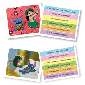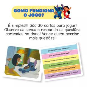 Observar as cenas por alguns minutos e responder ás questões sorteadas no dado, respondendo sobre Stitch, Lilo e suas aventuras. São 6 perguntas para cada cena. Esse jogo auxilia o aprendizado infantil, testando a memória e estimulando o desenvolvimento da linguagem. A criança vai nomear as figuras, trabalhando a fala e melhorando o vocabulário.