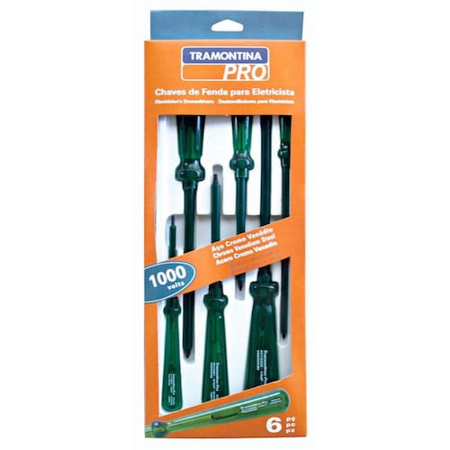 Jogo Eletricista 6 Peças Tramontina 44115406Características:1. As hastes das chaves de fenda são testadas em máquina de ensaio específica, para verificar o perfeito balanço entre resistência mecânica e dureza. 2. Os dimensionais das pontas são verificados com gabaritos-padrão calibrados e certificados, e a qualidade do fosfato é inspecionada ao microscópio. 3. As chaves de fenda isoladas são amplamente testadas, o que promove segurança na sua utilização em locais com tensões de até 1000 v ca. 4. Indicada para trabalhos em redes de tensão até 1.000 volts ca. 5. As ferramentas são produzidas e testadas conforme normas específicas.