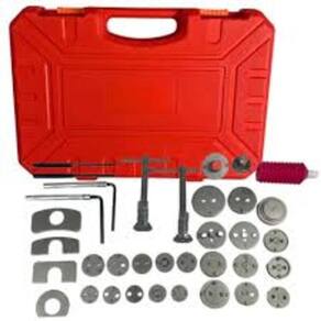 Kit ferramenta para pressionar o êmbolo da pinça de freio a disco traseiro, de veículos em que o freio de estacionamento, tem acionamento direto nas pastilhas. Atende também casos em que a pinça esquerda, tem rosca esquerda, exemplo: fiat stilo. Ideal para veículos em que o freio de estacionamento tem acionamento direto nas pastilhas.