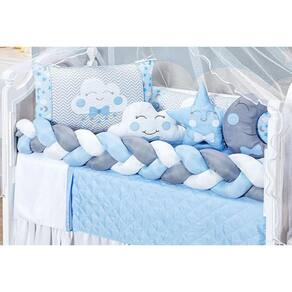 Jogo enxoval de berço com trança e lateral azul 12p Kit berço nuvem 12 peças Atenção este é o melhor e mais completo kit berço do mercado Total 12 peças 1 cabeceira------------------0.60x0.40 mts 1 tranças -----------------------1.25x0.0,12mts 1 laterais -----------------------1.25x0.25mts 1 lençol de cima ------------1.30x0.70 mts 1 fronha ---------------------0.28x0.38 mts 1 bando do mosqueteiro---1.40x0.20 mts 1 mosqueteiro---------------4.50x1.50 mts 1 almofada nuvem --------0.40x0.20 mts 1 almofada lua ----------0,30 x 0,22 mts 1 almofada estrela---- 0,30 x 0,30 mts 1 saia box -------------1,30 x 0,70 x 0,30 mts 1 edredom--------------------130cm x 75cm Descrição das peças:Tecido estampado: 100% algodão Tecido liso: 50% algodão 50% poliésterEnchimento 100% poliésterMosqueteiro 100% poliamida Informações importantes:O produto já vai pronto para o uso, com o enchimento já incluso.Acompanha as peças conforme a descrição, não esta incluso o berçoA cabeceira e as laterais do kit possuem zíper para retirar o enchimento, facilitando assim uma possível lavagem do produto.